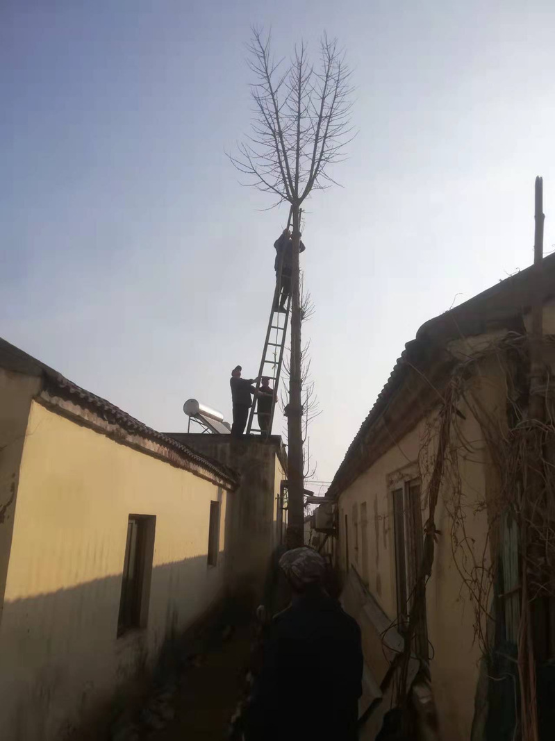 3月9日上午8時(shí),按照事先制定的方案,由農(nóng)場社區(qū)環(huán)綠所所長張海濤帶隊(duì),城西居委會(huì)協(xié)助,和環(huán)綠所員工一行7人來到幸福小區(qū)。首先對(duì)最高最粗最難砍伐的銀杏樹進(jìn)行砍伐。為防止大樹倒下砸壞兩邊房屋,有砍伐經(jīng)驗(yàn)的環(huán)綠所老員工李素兵現(xiàn)場提出:“從上到下,分段砍伐?!痹谡鞯脧埶L及眾人的同意后,李素兵立馬系好安全帶攀上樹頂,用手工鋸將銀杏樹頂端的叉枝逐個(gè)鋸掉,然后又用電鋸將銀杏樹從上到下分4段切割,最終平穩(wěn)將銀杏樹砍伐。緊接著一行人又來到另兩顆樹的地方,用同樣的方式,互相協(xié)作,很快又將兩顆樹砍伐?,F(xiàn)場圍觀的居民群眾對(duì)砍伐房前屋后到三顆樹個(gè)個(gè)拍手稱快。李志明老夫婦倆看到自家廚房后面10多米高的銀杏樹被伐,說了一句:“從今往后總算能睡個(gè)安穩(wěn)覺了,謝謝大家,謝謝!謝謝……”