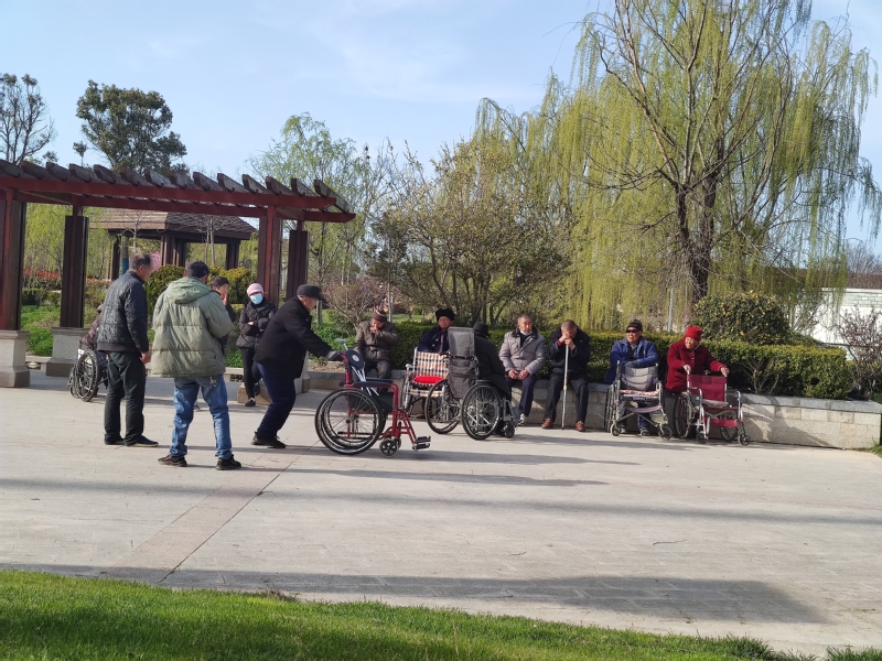 我們發(fā)現(xiàn),來這里休憩的老人中,推著輪椅來的老人特別的多,這些老人中,有自己轉(zhuǎn)著輪椅過來的,也有兒女推著他們過來的。“我爸總是讓我將他推到公園中來,他就喜歡與同齡人在一起熱鬧熱鬧,這樣他的心情才舒暢?!焙F成的兒子將老人推到公園坐椅著時(shí)對我說,“老人怎么說怎么好,我們做兒女的,滿足下他們的心愿就好了。圖為老人們在一起交談時(shí)的鏡頭。