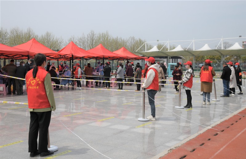 連日來,在淮海農(nóng)場職工休閑體育運(yùn)動廣場和農(nóng)場文化廣場上,隨處可見一抹“志愿紅”,他們當(dāng)中,有的手持小喇叭,一遍又一遍重復(fù)著“佩戴好口罩,保持好距離”的話語;有的人手一把測溫槍,堅守在卡口點(diǎn)不厭其煩地測量著經(jīng)過人的體溫;有的前后跑動著,為老年人、殘疾人提供便民服務(wù);有的變身“大白”“淺藍(lán)”,為核酸檢測采樣前進(jìn)行掃碼登記工作……