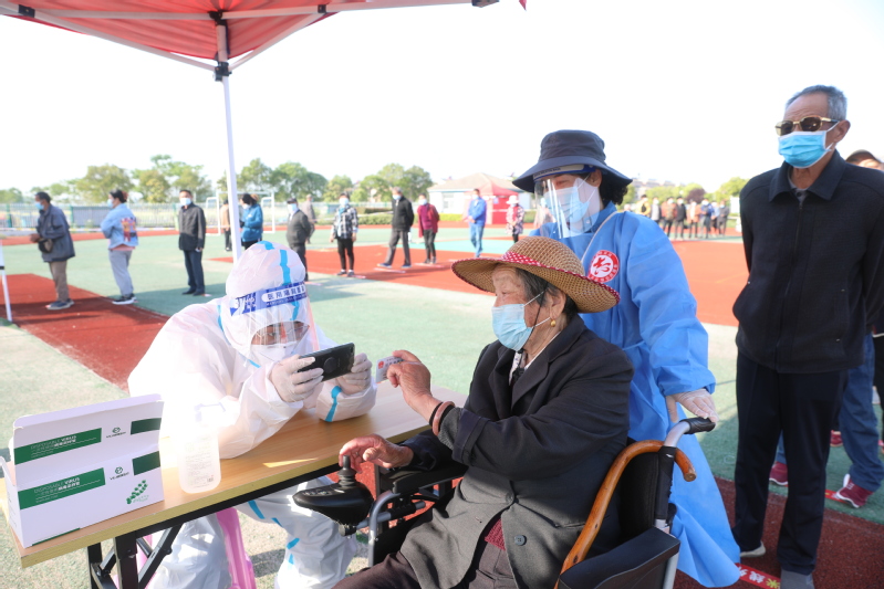 “請從這邊走!”轉(zhuǎn)業(yè)軍人、青年黨員孫強,標準軍人站姿導(dǎo)引著檢測居民有序進入,成為檢測中的一道風(fēng)景。青年黨員趙珊、沈燕是一對好姐妹,由于連續(xù)的叫喊讓沈燕的嗓子嘶啞,今天她倆特意交換的分工。“這隊人少,請到這隊來!”接過好姐妹手中的大喇叭,趙珊大聲招呼著,將進入檢測區(qū)的居民有序分流到3個采樣區(qū)。“你們在這里等我會兒,我先幫你們登記?!?/span>換成維護秩序后,沈燕時刻關(guān)注著檢測的人群。70多歲的王奶奶家住劉圩小區(qū),獨自一個坐著電動輪椅來到劉圩居委會核酸采樣點。沈燕見狀立刻上前引導(dǎo)她來到綠色通道,熱情地幫助她登記信息。不到5分鐘,王奶奶就完成了采樣。沈燕又小心地把她帶到了檢測出口。細心的黨員孫偉,在檢測中發(fā)現(xiàn)有不少行動不便的老人。今天他提前借來了一輛輪椅,看到年老體邁的老人,他就主動迎上去,把老人推進檢測綠色通道,從掃碼測溫到登記采樣,再到出口離開,最后把老人安全地交到老人家人手中。