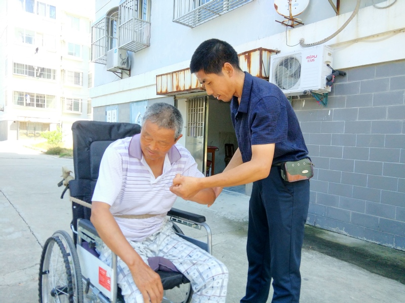貧困戶和獨居的老人互相幫扶組成別樣的“家”,對老人而言,晚年生活質(zhì)量提高了;對陳國軍來講,服侍老人的愛心和“家”的氛圍,讓他的生活更有了奔頭,這種互助的形式,既是為行動不便老年人晚年生活提供居家養(yǎng)老的新形式,也是貧困戶積極尋求脫貧的一種主動作為,以自己的勞動,過上有尊嚴(yán)的生活。圖為陳國軍在幫老人疏通筋骨時的鏡頭。