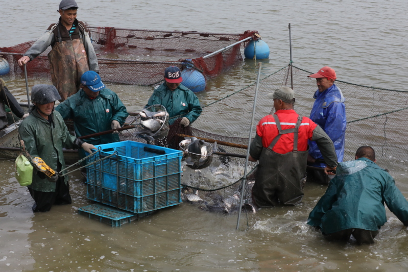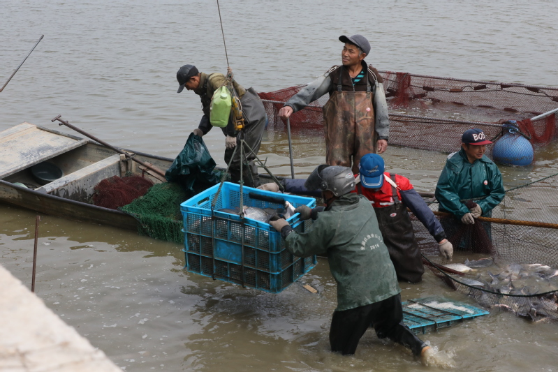 5月13日,寶應(yīng)湖農(nóng)場劉圩養(yǎng)殖場養(yǎng)殖戶楊金林正在起捕塘口鳊魚。