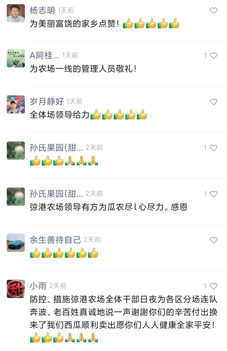 西瓜場來臨正值疫情防控形勢最嚴(yán)峻的時(shí)候,按照上級疫情防控要求,弶港農(nóng)場黨委制定出防控西瓜運(yùn)銷車輛閉環(huán)管理工作方案,成立西瓜運(yùn)銷“疫”線指揮部,設(shè)立八個(gè)工作專班,近百人的西瓜閉環(huán)運(yùn)銷隊(duì)伍,日夜奮戰(zhàn),全程嚴(yán)密管控西瓜運(yùn)銷貨車閉環(huán)管理,確保全國各地貨車開得進(jìn)來,農(nóng)場職工西瓜賣得出去。在這場戰(zhàn)役中,全場廣大黨員干部在抗“疫”一線“佩黨徽、亮身份、做表率”,以“一名黨員一面旗幟”的良好形象,全力以赴,吃苦在前、沖在一線,弶港農(nóng)場2萬多噸“弶農(nóng)”牌西瓜順利銷售。“美麗弶農(nóng)”視頻號上反映西瓜運(yùn)銷工作的小視頻,7千多次瀏覽量,幾百人點(diǎn)贊轉(zhuǎn)發(fā),閉環(huán)運(yùn)銷工作得到廣大職工群眾的一致稱贊,公司黨委書記胡廣斌在工作群中感嘆道“得到群眾的好評不容易”。