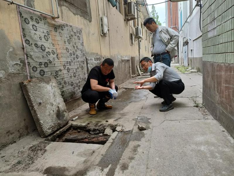 5月19日下午,新洋社區(qū)城西居委會黨支部書記蔡文良帶領黨員王強及居民組長一行在一號樓前面清理下水道。早在兩個多月前,一號樓就出現了下水管堵塞的現象,由于無人維修,堵塞問題日益嚴重,管道污水逐漸上漲,漫延到地面,妨礙了樓內居民的進出。