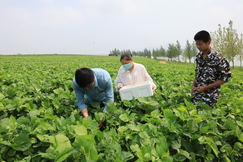 7月2日,贛榆區塔山鎮店子村豆丹養殖基地,崗埠農場公司富民科技園技術人員正在一絲不茍地教當地村民投放豆丹蟲卵大家不顧高溫,小心翼翼地用粘著豆丹蟲卵的牛皮紙,包裹好嫩綠的黃豆葉,然后用訂書機訂好。