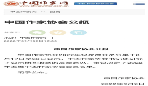 近日,根據中國作家協會公報,中國作家協會2022年擬發展會員名單于8月17日至23日公示。中國作家協會書記處研究了公示期間收到的反饋意見,審議決定了2022年發展中國作家協會會員名單,并于2022年9月2日進行公布。其中江蘇60人,江心沙農場有限公司90后職工袁偉榜上有名。