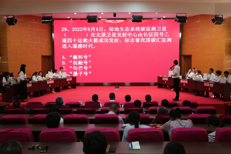 本次比賽分為兩個階段進行,在6月25日的預賽中,全場18支代表隊進行了筆試考核,通過每隊總比分,選出了今天6支參加決賽的隊伍。在主持人的宣布下,比賽正式拉開帷幕?!罢埪狀},黨的二十大報告指出……請開始搶答?!薄罢?號臺答題,三號臺搶答犯規……”在現場,6支代表隊“八仙過海各顯神通”,大家“邊賽邊學”、“以賽促學”,在必答題、搶答題和風險題3個環節上充分發揮團隊力量,傾力配合。各支代表隊你追我趕,互不相讓,臺下觀眾也聚精會神,對著屏幕學習黨的二十大知識,現場不時發出熱烈的掌聲。在每個環節休息階段,大會還組織開展了現場互動答題,并準備了精美禮品?,F場觀眾紛紛踴躍搶答,再度將本次競賽活動氣氛推向了頂峰。