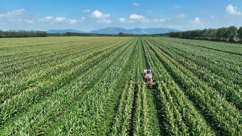 蘇墾農發抓好12萬畝玉米大豆帶狀復合種植精細化管理,在去年成功試驗的基礎上,組織農機對玉米進行去頂,既降低植株高度,減少倒伏風險,又增加了玉米大豆受光面積,促進產量提高。圖為農機在蘇墾農發東辛分公司玉米大豆田間進行玉米去頂作業。