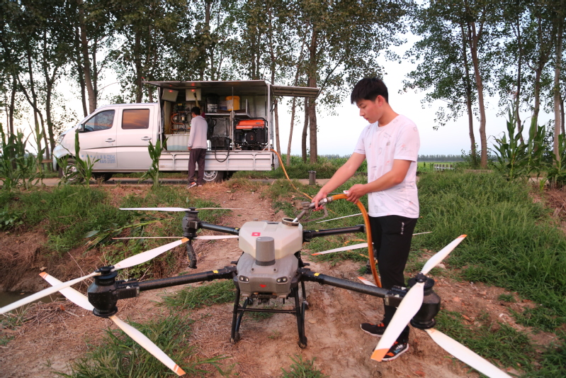 “這塊地是梯形的,等會這塊地飛完,要把地邊找一找,防止漏飛?!?月30日晚,在蘇墾農發崗埠分公司王溝生產區葛莊隊的一處田邊,大隊管理員葛高樹正和無人機飛手進行交流,叮囑操作注意事項。在田間,一架大型無人機閃爍著燈光,在飛手的操作下有條不紊地進行噴施作業,所到之處卷起陣陣白霧。