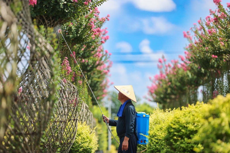 8月14日,江蘇省鹽城市射陽縣,在江蘇農(nóng)墾新洋農(nóng)場容器苗項目基地,管理人員正在為紫薇花瓶噴施藥物防病治蟲。據(jù)悉,新洋農(nóng)場建成配有水肥一體、智能控制等設備的容器苗圃200畝。張偉生攝(中經(jīng)視覺)