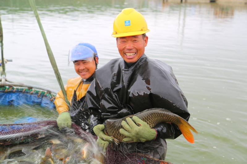 正值淡水魚出塘上市季節,江蘇省連云港市海州區江蘇農墾崗埠農場南漁場,大型吊車正在起網捕撈鯉魚,一幅人歡魚躍的水上夏收景象。圖為漁民在展示捕撈的大鯉魚。  徐衛 攝(來源:大國三農)