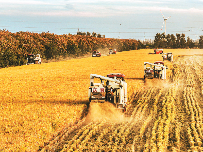 11月3日,江蘇省鹽城市射陽(yáng)縣新洋農(nóng)場(chǎng)組織收割機(jī)械搶收水稻。張偉生攝(人民視覺(jué))