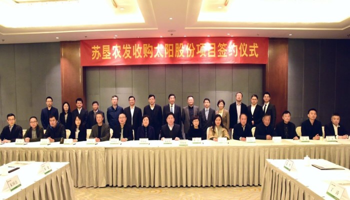 11月15日下午,蘇墾農(nóng)發(fā)股份公司在南京隆重舉辦收購(gòu)太陽(yáng)股份項(xiàng)目簽約儀式,集團(tuán)公司總經(jīng)理、蘇墾農(nóng)發(fā)股份公司董事長(zhǎng)胡兆輝主持本次儀式并講話,集團(tuán)公司黨委委員、蘇墾農(nóng)發(fā)股份公司總裁蘇志富,太陽(yáng)股份董事