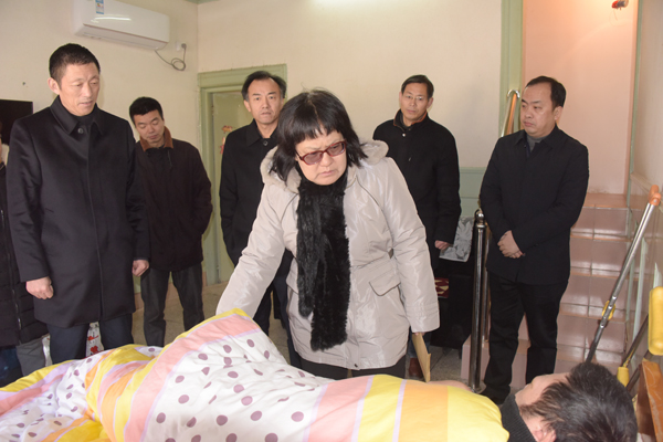 2月6日上午,集團公司黨委副書記姚準明一行來到新曹農場走訪慰問困難職工,為他們送去集團黨委的真情關愛。場領導陳國強、高國平、徐坤山等陪同慰問?! ∫拭魇紫葋淼揭虿≈吕毠は臐摄y家中,