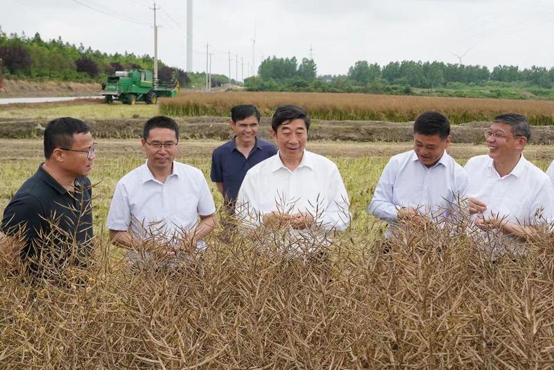 6月1日上午,集團公司黨委副書記、總經(jīng)理胡兆輝到弶港檢查指導“三夏”工作。胡兆輝先后考察了蘇墾農(nóng)發(fā)弶港分公司小麥田、糧食烘干線、油菜收割現(xiàn)場,認真聽取一線工作人員的情況介紹,詳細了解蘇墾農(nóng)發(fā)弶港分公司“三夏”工作進展,對當前夏熟作物的生產(chǎn)與管理工作以及全力支持“淮海啤麥會戰(zhàn)”工作表示充分肯定。他指出,由于天氣影響,今年“三夏”生產(chǎn)形勢十分嚴峻。要圍繞“五不”和“五確保”目標,統(tǒng)籌利用農(nóng)機、曬場、烘干、糧庫等資源,搶抓關(guān)鍵農(nóng)時,確保夏糧豐產(chǎn)豐收。他要求,要深入開展好主題教育,按照“學思想、強黨性、重實踐、建新功”總要求,貼近工作實際開展好調(diào)查研究,查擺問題,把調(diào)研成果轉(zhuǎn)化為解決問題、改進工作的實際舉措;要堅決打贏“三夏”這場硬仗,弶港要一如既往地在保種子上挑大梁,確保不壞一粒種子,油菜、商品糧做到顆粒歸倉,為保障糧食安全做出應有的貢獻。要高質(zhì)量做好夏插、夏管工作,為秋熟豐產(chǎn)豐收打下堅實基礎。針對可能出現(xiàn)的惡劣天氣,做好支援兄弟農(nóng)場夏收會戰(zhàn)的各項準備工作;要統(tǒng)籌謀劃,做好安全生產(chǎn)、社區(qū)管理、產(chǎn)業(yè)發(fā)展等各項工作,將主題教育的學習成效落在推動企業(yè)高質(zhì)量發(fā)展的工作實績上。