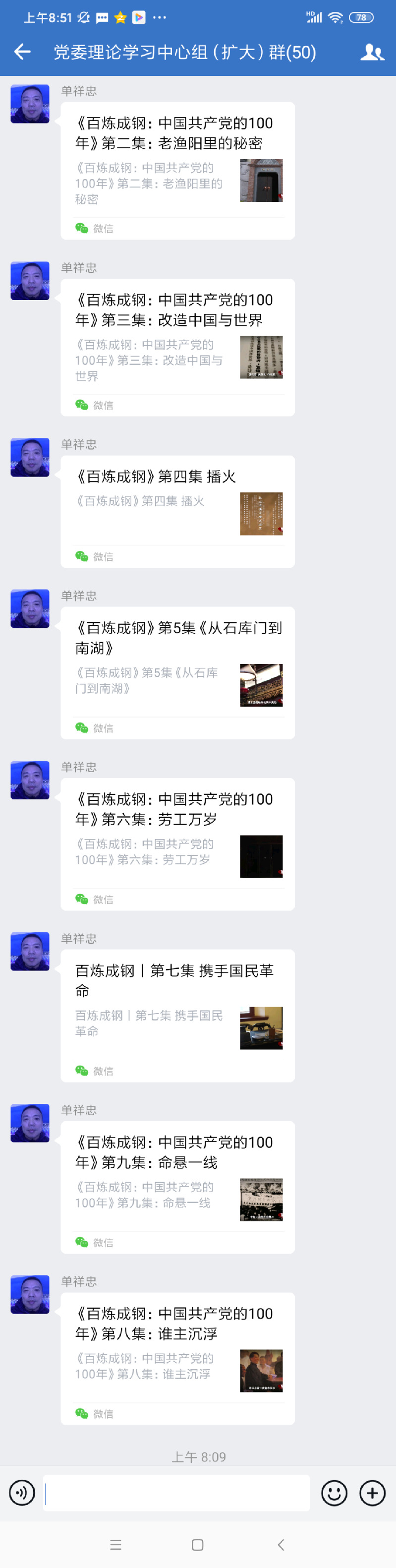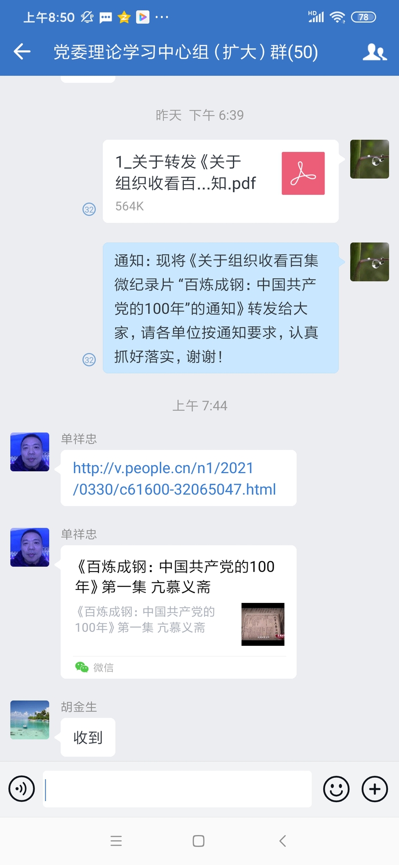 淮海農(nóng)場公司在昨天傍晚接到江蘇農(nóng)墾黨史學(xué)習(xí)教育第三組《關(guān)于組織收看百集微紀(jì)錄片百煉成鋼:中國共產(chǎn)黨的100年”的通知》后,立刻借助企業(yè)微信平臺黨委理論學(xué)習(xí)中心組(擴大)群進行轉(zhuǎn)發(fā)落實,農(nóng)場黨委書記單祥忠在今天上午便將搜集來的《百煉成鋼:中國共產(chǎn)黨的100年》的紀(jì)錄片第1至第9集的視頻發(fā)布的學(xué)習(xí)群中,并以此來進一步激發(fā)起廣大黨員干部職工學(xué)習(xí)黨史的熱情,在方便大家觀看學(xué)習(xí)中,不斷提升黨史的學(xué)習(xí)教育成效。