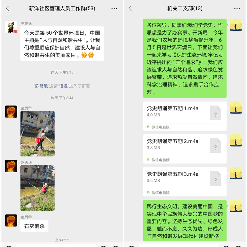 機(jī)關(guān)二支部則把黨史教育與環(huán)境整治相結(jié)合,通過(guò)支部黨史朗誦專(zhuān)題學(xué)習(xí)《保護(hù)生態(tài)環(huán)境牢記習(xí)近平提出的“五個(gè)追求”》,要求大家在農(nóng)場(chǎng)公司黨委的領(lǐng)導(dǎo)下,追求人與自然和諧、追求綠色發(fā)展繁榮、追求熱愛(ài)自然情懷、追求科學(xué)治理精神、追求攜手合作應(yīng)對(duì),堅(jiān)持生態(tài)優(yōu)先、綠色發(fā)展,馳而不息,久久為功,以更美的環(huán)境面貌慶祝建黨百年、迎接建場(chǎng)70周年。
