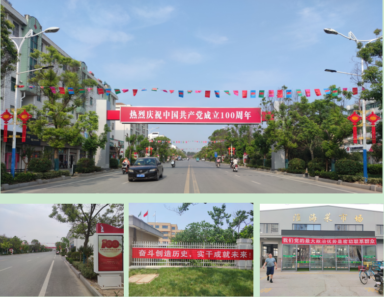 漫步在淮海路上,高大上的跨路宣傳標(biāo)語、紅彤彤的宣傳櫥窗、飄動的百年慶典標(biāo)識,還有那些一幅幅與百年慶典有關(guān)的宣傳橫幅,和優(yōu)美的農(nóng)場生態(tài)環(huán)境相互輝映,處處洋溢著喜慶的氛圍。