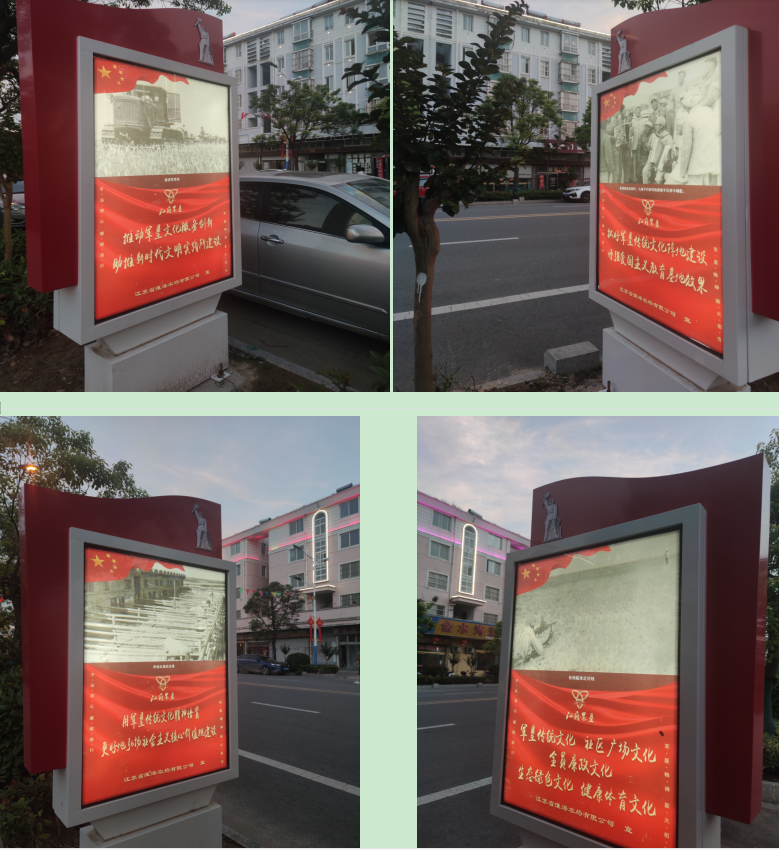 這些燈箱中,廣告燈箱的一面看到統(tǒng)一印制的建黨百年歷史的畫面外,在燈箱的另一面,除了印制江蘇農(nóng)墾統(tǒng)一的LG標(biāo)識(shí)和“不忘初心 繼續(xù)前行”“軍墾精神 薪火相傳”的細(xì)小字體外,還分別印有農(nóng)建四師將士在農(nóng)場(chǎng)“三大戰(zhàn)役”進(jìn)程中開墾建設(shè)的不同老照片附說明,印有不同風(fēng)格的軍墾傳統(tǒng)文化標(biāo)語,并在畫面外的框架上,安裝了鑲嵌在其上的軍墾傳統(tǒng)文化的標(biāo)志,濃郁的軍墾傳統(tǒng)文化在廣告燈箱中的完美組合,讓仍健在的老軍墾們甚是激動(dòng),說農(nóng)場(chǎng)黨委以這種方式宣傳弘揚(yáng)軍墾傳統(tǒng)文化,這是對(duì)他們建設(shè)農(nóng)場(chǎng)最好的肯定。