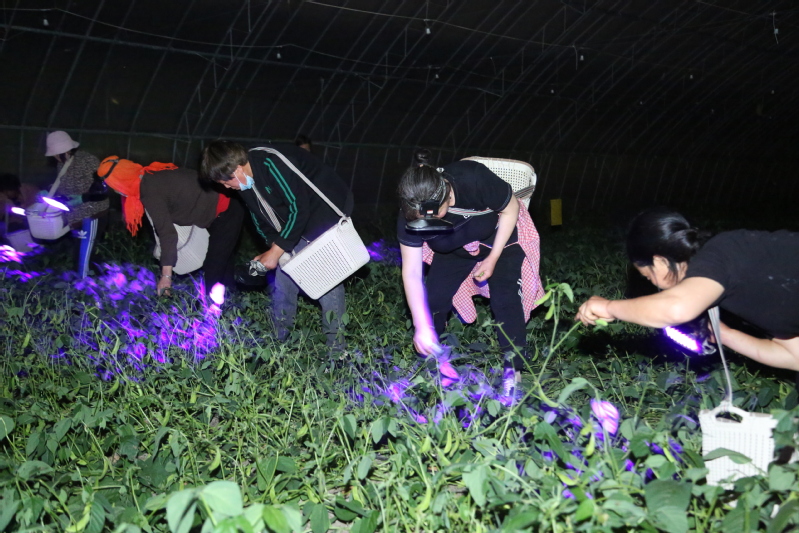 5月12日夜間,在崗埠農(nóng)場高效農(nóng)業(yè)示范園一處豆丹養(yǎng)殖基地,工作人員利用紫光燈在黑夜里收獲豆丹成蟲。當前正是豆丹大量上市的時節(jié),當?shù)負屪マr(nóng)時,加緊收獲豆丹成蟲供應市場。