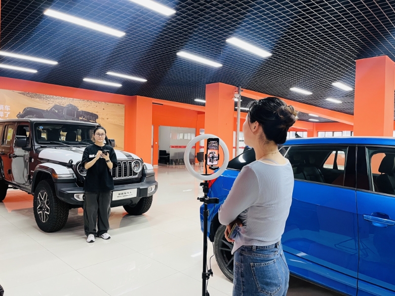 “牧馬人原廠配備全地形255 75R18輪胎、中控觸摸屏由8寸升級到12寸、涉水深度達760mm?!碧K舜錦尚公司(Jeep4S店)主播陳佳琪正通過直播間為客戶360°全方位展示和講解車輛配置,她耐心地解答客戶問題,1名客戶已成功預約進店。