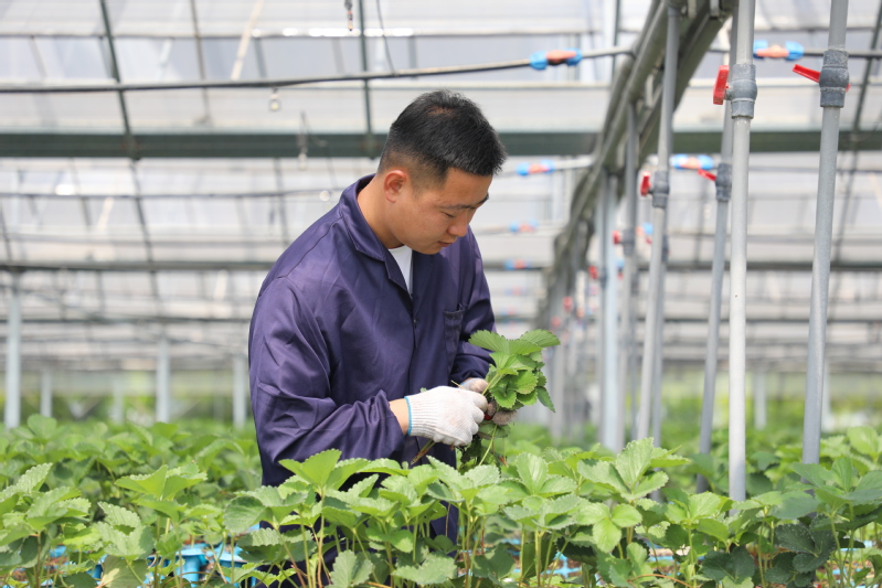 當前正值草莓苗生長的關(guān)鍵期,在三河農(nóng)場科技園區(qū)草莓高架大棚內(nèi),工作人員正在打草莓老葉并檢查草莓苗的生長情況,以便及時預防赤霉病、炭疽病等各種病蟲害。