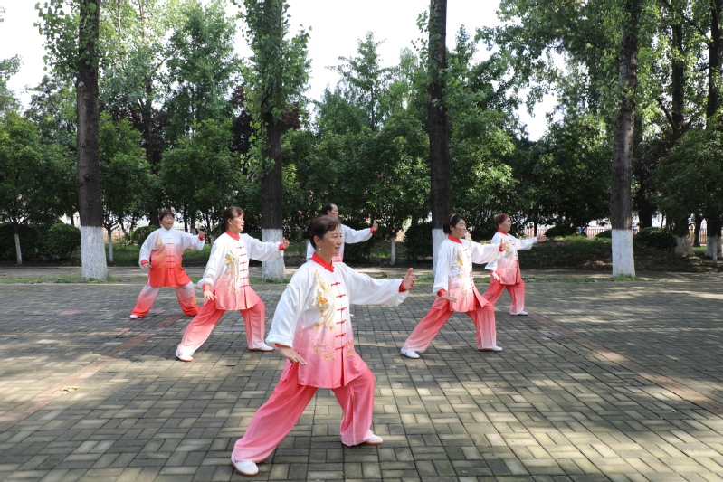 每日清晨,走進(jìn)東辛公園,景色優(yōu)美、河水蕩漾、綠樹(shù)成蔭、百鳥爭(zhēng)鳴,荷塘內(nèi)夏日荷花婀娜多姿、競(jìng)相綻放,藍(lán)天白云和隨風(fēng)搖曳的柳枝倒映在水面上,宛若一幅動(dòng)態(tài)的風(fēng)景畫,給東辛公園增添了幾分獨(dú)有的美麗。穿過(guò)蜿蜒曲折的步道,在東辛公園西北角,這里參天大樹(shù)四面環(huán)繞,空氣清新沁人心脾,是居民群眾免費(fèi)的室外“健身房”。只見(jiàn)6名太極愛(ài)好者身著粉色太極拳服,音箱內(nèi)播放著舒緩的音樂(lè),他們動(dòng)作整齊劃一,身形靈活揮灑自如,將太極拳含蓄內(nèi)斂、連綿不斷、急緩相間、行云流水的風(fēng)格展現(xiàn)得淋漓盡致,吸引了許多公園晨練者駐足觀看。其中一位愛(ài)好者楊老師說(shuō):“平日里大家工作都特別忙,現(xiàn)在盛夏時(shí)節(jié)天亮的早,公園內(nèi)風(fēng)景優(yōu)美,我們太極拳愛(ài)好者每天6點(diǎn)半左右就開(kāi)始集合鍛煉,堅(jiān)持打太極對(duì)男女老少身體都特別有益,尤其對(duì)肩頸舒緩非常有幫助,越來(lái)越多的人加入到太極拳隊(duì)伍中來(lái)?!痹诰毩?xí)隊(duì)伍中,出現(xiàn)了不少年輕人的身影,充分展示了農(nóng)場(chǎng)居民健康積極、樂(lè)觀向上的精神風(fēng)貌。傍晚時(shí)分,結(jié)束了一天忙碌的工作和學(xué)習(xí),東辛文化廣場(chǎng)燈光籃球場(chǎng)上人頭攢動(dòng),這里有暑期放假的學(xué)生,也有居民籃球愛(ài)好者,還有單位職工相約三五好友一道來(lái)到這里揮灑汗水,切磋球技。傳球、控球、擋拆、
