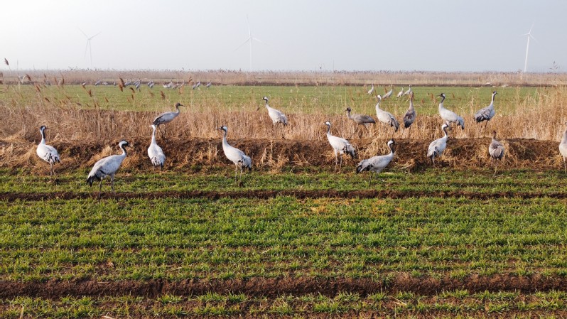 “快看,好多大鳥!”1月12日上午,在淮海農(nóng)場七分場社區(qū)墾三隊的麥田里,分場技術(shù)員王凌云在用無人機(jī)巡田時,突然發(fā)現(xiàn)了成群的灰鶴及幾只稀有丹頂鶴在此棲息。為留下這些珍稀鳥類的影像資料,他連忙用無人機(jī)對準(zhǔn)拍攝,記錄下這些鳥兒在這里駐足的珍貴鏡頭,這也是淮海農(nóng)場首次看到如此多的珍稀鳥類群體聚集在此越冬。七分場是淮海農(nóng)場最東端的一個分場,毗鄰國家丹頂鶴自然保護(hù)區(qū),占地1萬多畝,與黃海一堤之隔,海岸線南北長達(dá)近5公里。堤外濁浪滾滾,堤內(nèi)綠意濃濃,少人的管理,靜謐的環(huán)境,綠色的麥苗,搖動的風(fēng)車和黃色的枯草,讓這里的生態(tài)風(fēng)景如畫。近百只灰鶴和丹頂鶴組成的“團(tuán)隊”落腳農(nóng)場麥地,它們或追逐嬉戲,或駐立棲息,或低頭覓食,在無人機(jī)的視角下,盡顯生態(tài)之美、和諧之美、發(fā)展之美?!拔沂窃趬ㄈ狖溙锢锟匆娝鼈?,當(dāng)時離它們差不多200米左右,但是距離太遠(yuǎn)不能完全確定,后來請我們生產(chǎn)區(qū)珍禽巡護(hù)員梁永河與珍禽保護(hù)區(qū)專家聯(lián)系辨認(rèn),才確定是國家一級保護(hù)動物丹頂鶴和國家二級保護(hù)動物灰鶴。”王凌云說,當(dāng)時農(nóng)渠里飄起毛茸茸的蘆花,襯得麥苗綠油油,綠黃交界處,立著一群雪白身影,丹頂鶴和灰鶴悠然踱步其間,自成風(fēng)景,讓我倆甚是贊嘆。多年